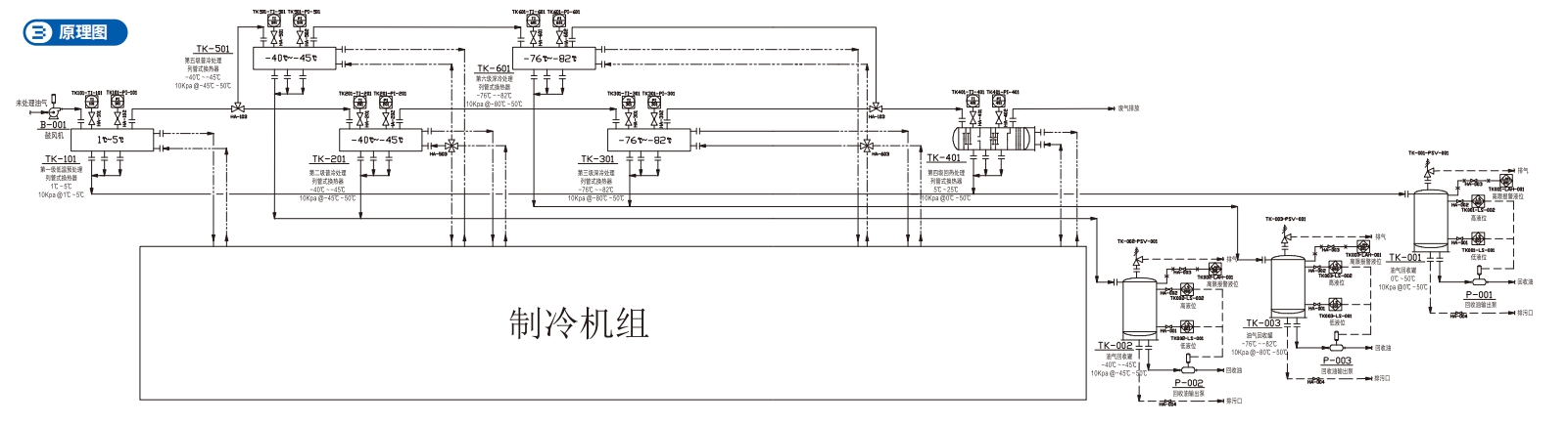 同時,部分?藝要求連續?時間?產?作,為確保此過程中VOCs?體回收的連續性,我公司可選擇提供的VOCs?體回收設備的冷凝單元(-40℃和-75℃冷場)為雙?路通道,當?邊?路壓降達到設定值時,系統?動切換到另?待機系統?作,同時冰堵通道進?融霜過程,融冰結束后可根據指令?動快速地恢復冷場,處于恒溫狀態,確保溢出?體的持續穩定回收。